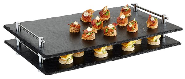 GN 1/1 Naturschieferplatte , 53 x 32,5 cm, H: 6 cm , Materialstärke 6-9 mm , verchromte Griffe, inkl. fest , verschraubten Distanzstücken , gebrochene Kanten , glänzende, versiegelte , Oberfläche , -HOCHSTAPLER- ,