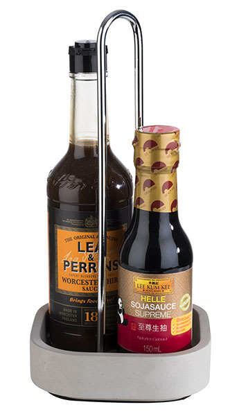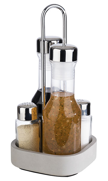 Menage -ELEMENT- , 12,5 x 12,5 cm, H: 25 cm , Set bestehend aus: , – Basis, Beton , Metall, verchromt , Pfeffer- und Salzstreuer, Essig- und Ölbehälter, Glas mit Edelstahldeckel , Ausgießer aus Polyethylen , möbelschonende Unterseite