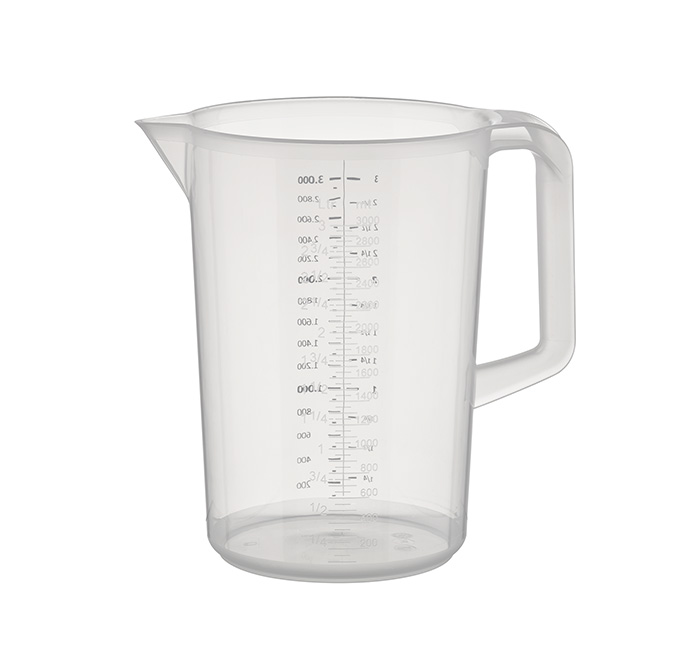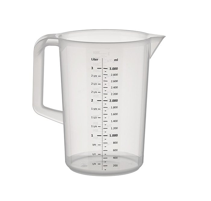 Messbecher -PRO- , Ø 17 cm, H: 23,5 cm, 3 Liter , Polypropylen , mit geschlossenem Griff , geprägte Maßskalierung außen , Liter- / Milliliter-Einteilung