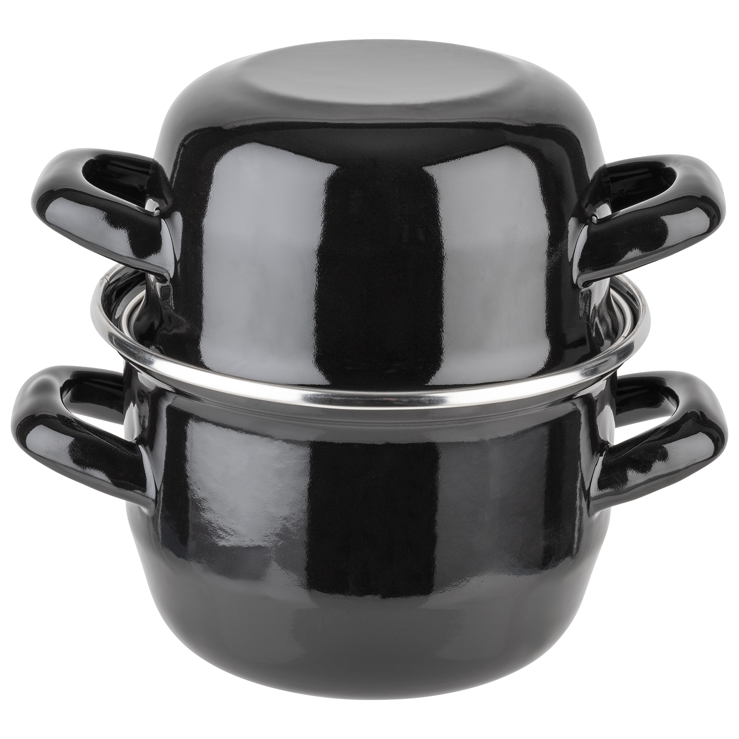 Servier-Muscheltopf für 0,5 kg, Ø 13,5 cm, für 1 Portion , schwarz emailiertes Stahlblech, mit Edelstahlrand , Inhalt: Topf 0,75 Liter , Deckel: 0,60 Liter , Nicht zum Kochen geeignet! , Darf nicht erhitzt werden!