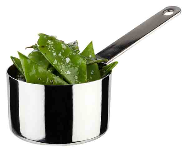 Stielkasserolle / Serviertopf , Ø 7 cm, H: 3,5 cm , Edelstahl , 0,14 Liter , Griff: 9 cm , -SNACKHOLDER-
