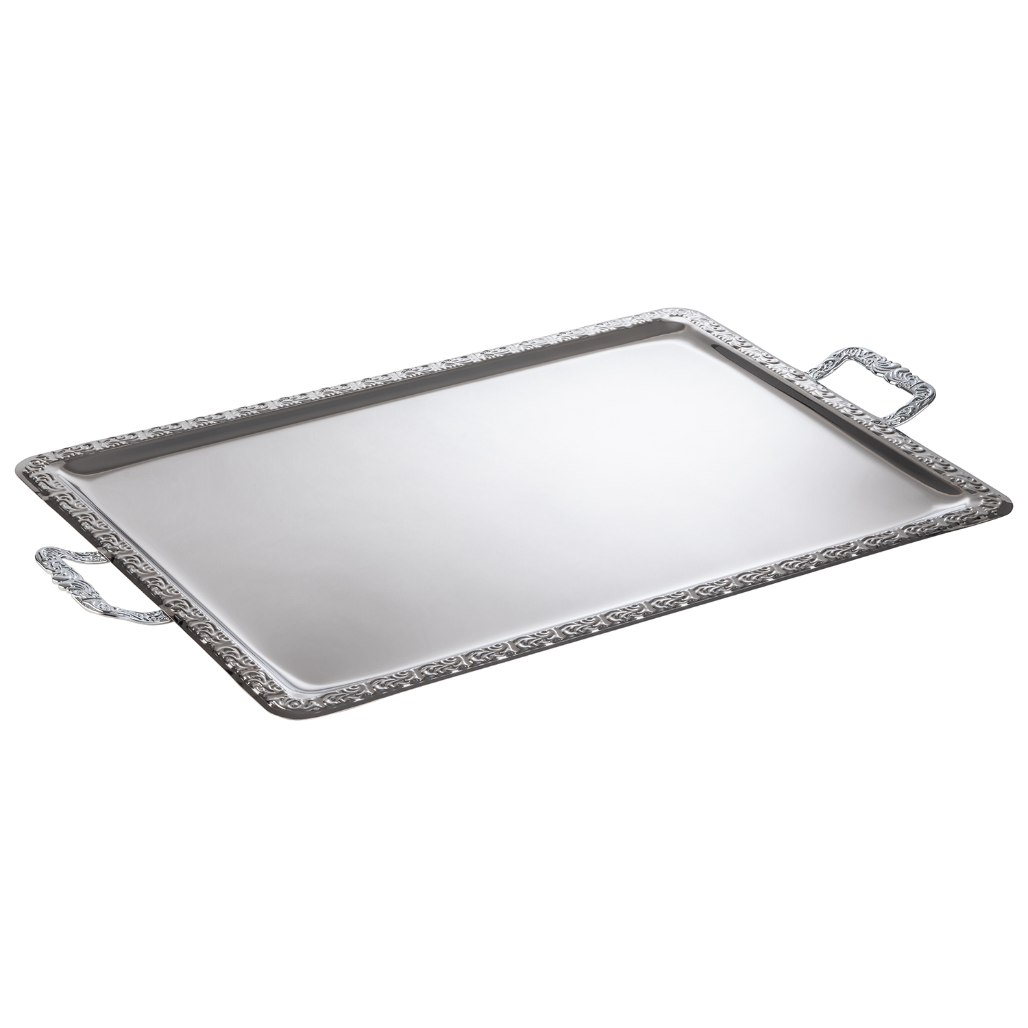 Tablett -SCHÖNER ESSEN- , 75 x 44,5 cm, H: 3 cm , 18/0 Edelstahl, mit Dekorrand , Griffe Zinkdruckguss verchromt, Griffe fest genietet