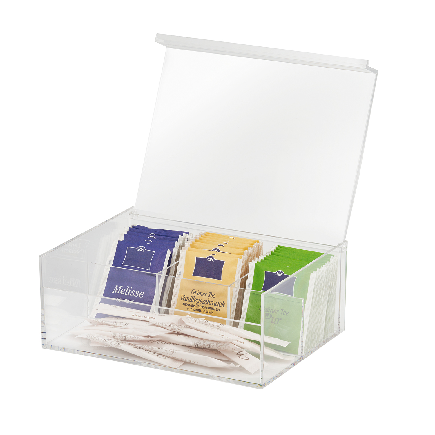 3 Fächer für kuvertierte Teebeutel, 1 Fach für Zucker, Kekse, etc., Deckel aufklappbar