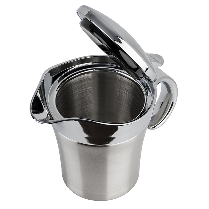 Thermo-Sauciere , 19 x 12,5 cm, H: 13 cm , Edelstahl, doppelwandig , Fassungsvermögen ca. 0,4 Liter, Ausgießer, Griff und Deckel- , unterteil aus ABS-Kunststoff , Klappdeckelverschluss , Einhandbedienung