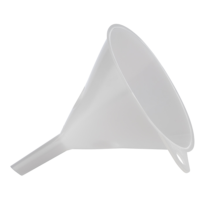 Trichter , Ø 14 cm, H: 16,5 cm , Polyethylen, weiß , Durchlass: Ø 15 mm , mit Aufhängeöse , mit Entlüftungsrippen