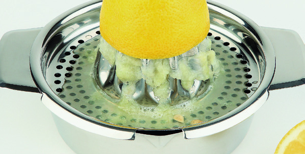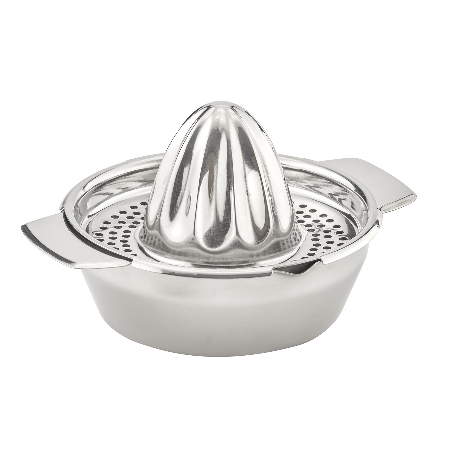 Zitronenpresse , Ø 12 / 17 cm, H: 10,5 cm , 18/8 Edelstahl , hochglanzploiert , 2-teilig, 0,35 Liter , mit 2-seitigem Schüttrand