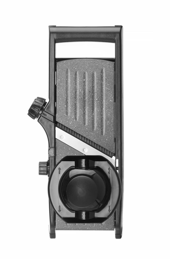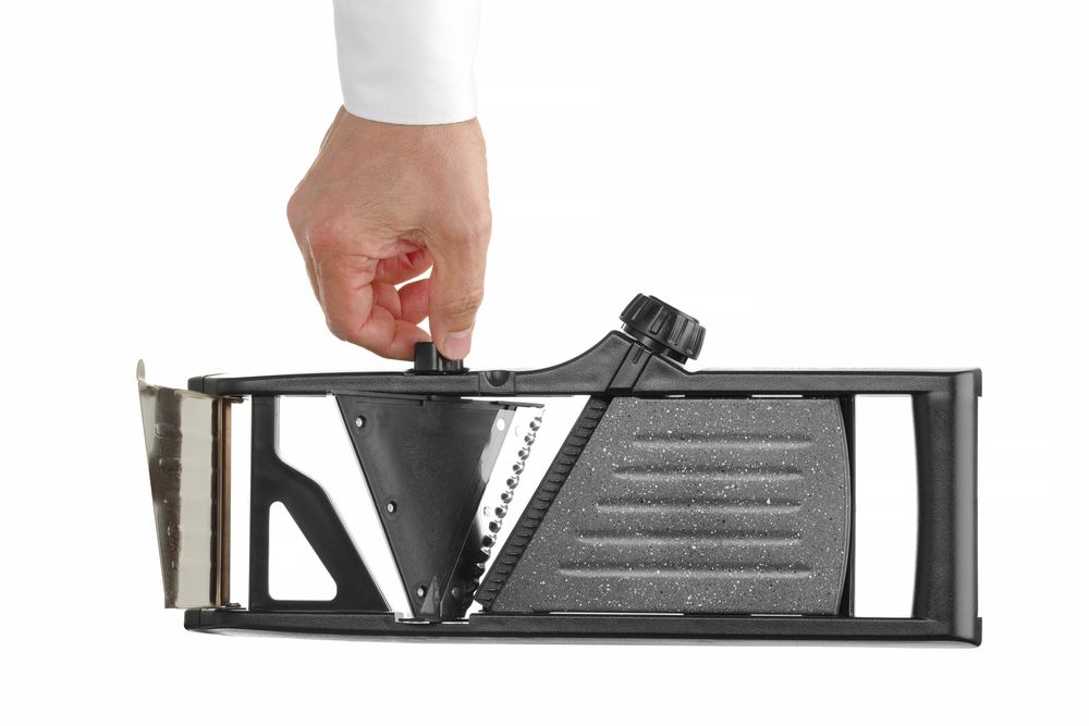 Möglichkeit, die Julienne-Klinge zur Reinigung der Mandoline zu entfernen, Entriegelungsposition auf dem Knopf aufgedruckt.
