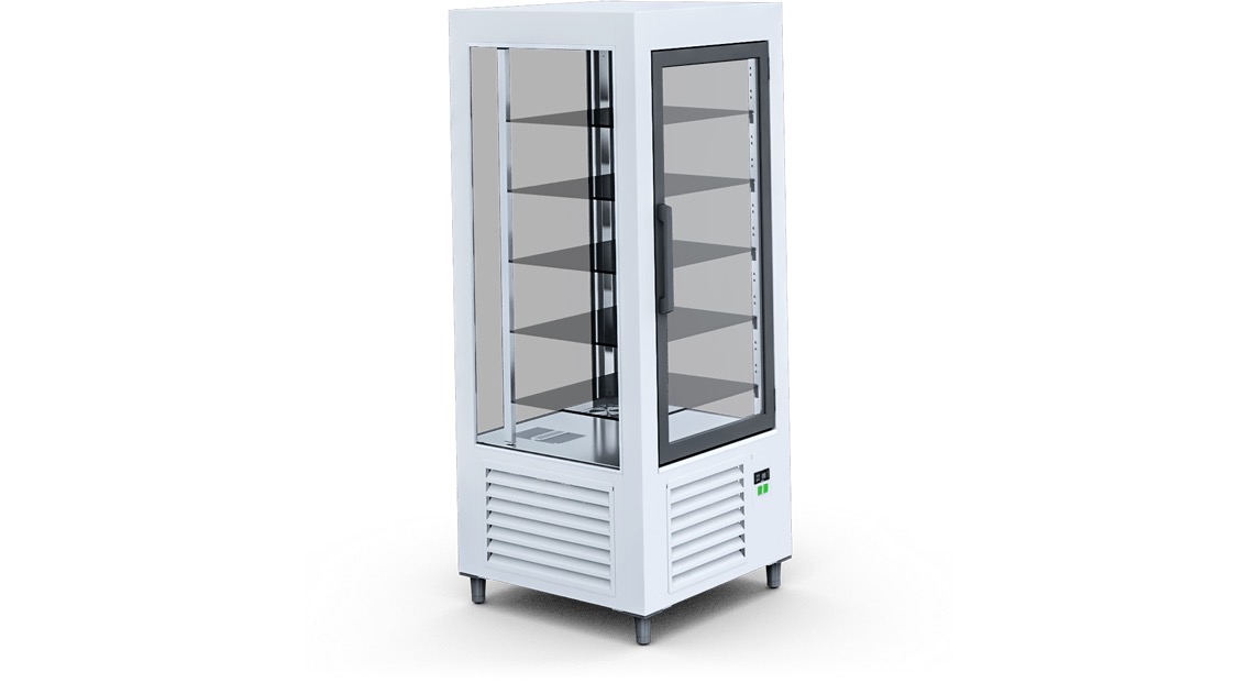 Kuchenvitrine Jola 4 Mal Abmessungen: 750x755x1865 mm Temperaturbereich: +5°C / +15°C Kältemittel: R290 Volumen: 600 Liter Gewicht: 155 kg Kälteleistung: 896 Kühlaggregat innen Dynamische Kühlung Vierseitenverglasung Drehflügeltür mit Isolierverglasung – Türanschlag nach Wahl Innenverkleidung aus rostfreiem Blech Außenverkleidung aus Blech – Farbauswahl möglich (Farbmuster) 5 St. Glasablagen, höhenverstellbar Innenbeleuchtung – LED – Leuchtstoffröhren (für Backwaren) automatische Abtauung Automatische Tauwasserverdunstung Elektronische Temperaturregelung mit Digital – Display Tonsignal zur Meldung der Verunreinigung des Verdunsters oder der Blockade des LüftersTemperaturbereich: +5°C/+15°C Aggregat: intern Dynamische Kühlung Aus rostfreiem Blech Vierseitenverglasung Drehflügeltür mit Isolierverglasung Türanschlag nach Wahl 5 runde drehbare Glasablagen Innenbeleuchtung LED– Leuchtstoffröhren (für Backwaren) automatische Abtauung Automatische Tauwasserverdunstung Elektronische Temperaturregelung mit Digital-Display