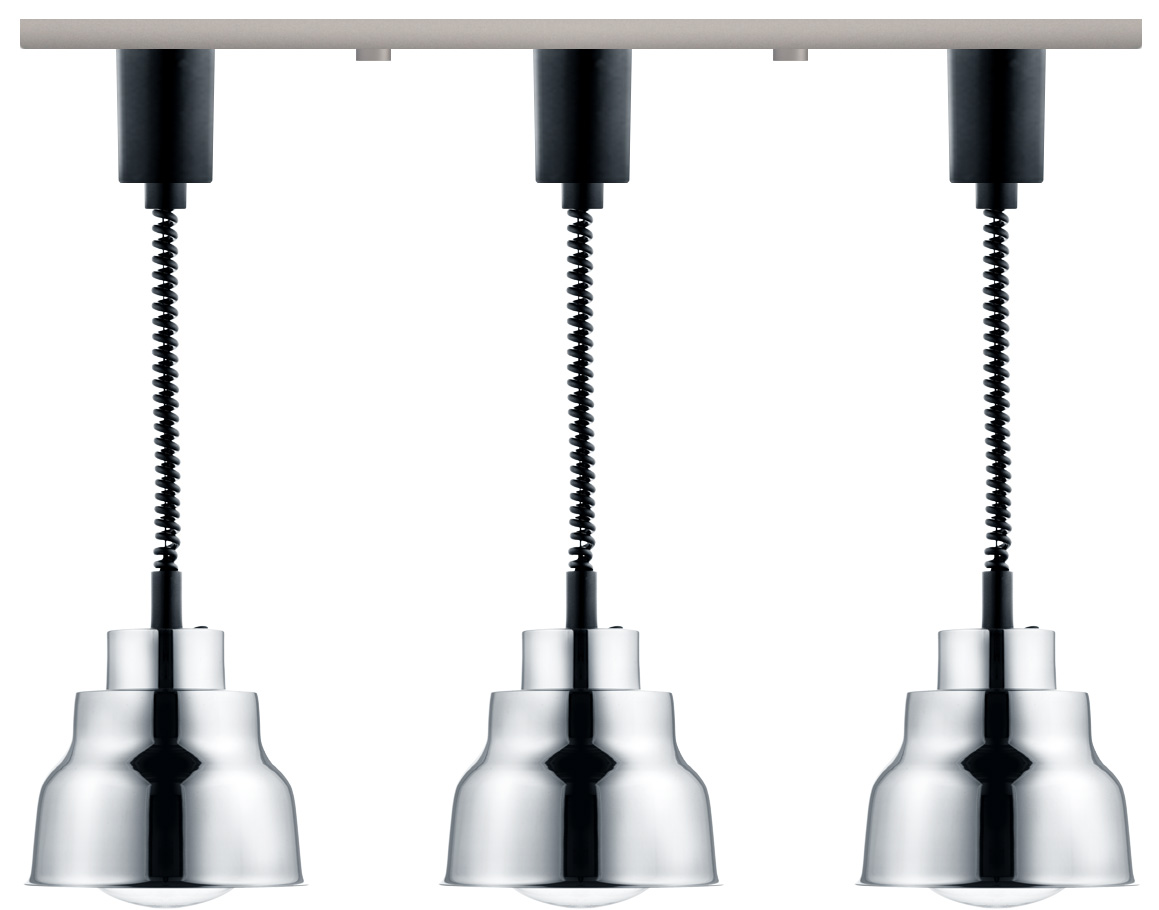 Lampenschirm aus verchromtem NE-Metall • Mit separaten Ein-/Ausschaltern • Ausziehbar von 900 auf 1700 mm • Inkl. Infrarot-Leuchtmittel (weißes Licht) • Leiste titanfarben pulverbeschichtet • Leiste 940x85x20 mm • Schwarze Kabel