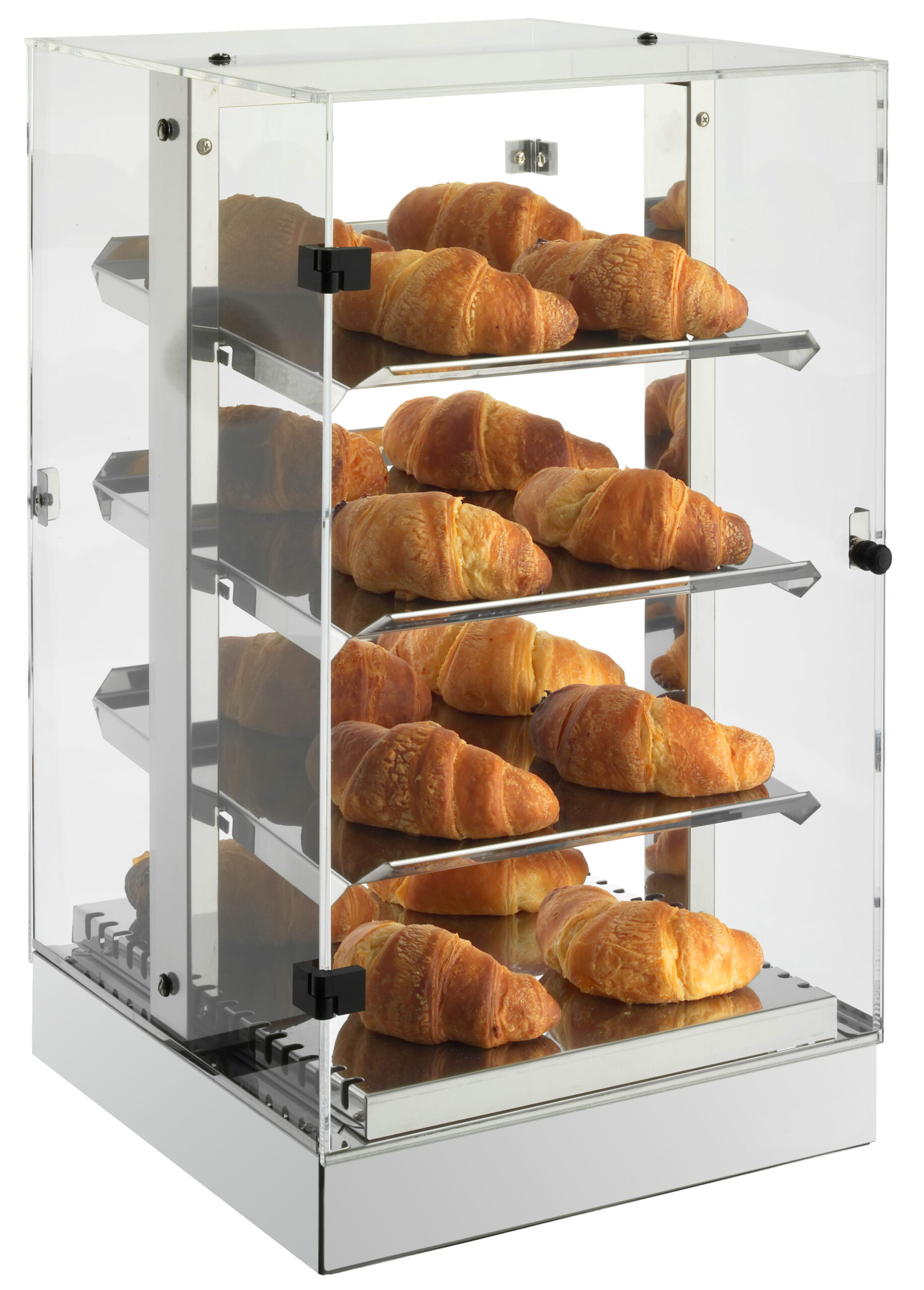 Edelstahl • Haube Acrylglas • Thermostatregler +30° bis +70°C • beidseitig aufklappbar • Kontrollleuchte • Wasserschale zur Luftbefeuchtung • 4 Ebenen à 288×288 mm • untere Ebene beheizt