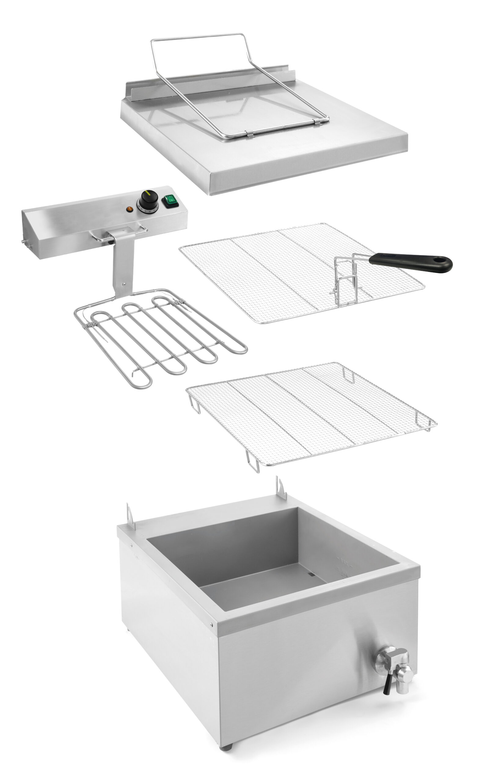 Ideal für Donuts, Schnitzel und Frittiergebäck • Mit Deckel, der auch als Tropfschale dient • Geschweißter Öltank 400 x 400 x 160 mm • Markierungen für minimalen und maximalen Füllstand • 2 Frittierroste 354 x 383 mm • Mit Cool-Touch-Griff • Kaltzonenbereich für eine längere Nutzungsdauer des Öls • Abnehmbares Heizelement mit Abschaltfunktion beim Abnehmen und Überhitzungsschutz • Heizungsschutz • Mit Fettablauf • Temperaturbereich 50° bis 190°C • Kontrollleuchte • Antirutschfüße • Inhalt 12 Liter