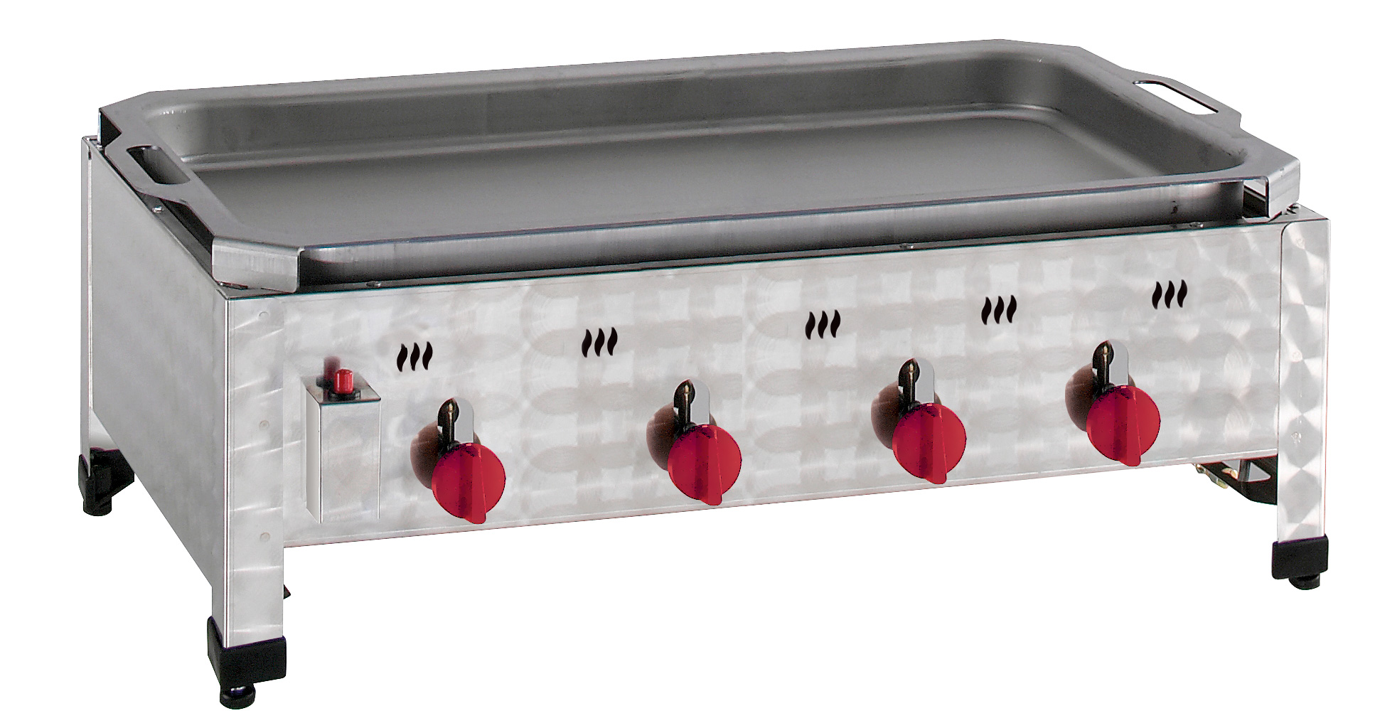 Komplett inkl. Rost und Schwarzblechpfanne mit Fixierung • Gehäuse doppelwandiger Edelstahl • Mit Flammabdeckung und Fettwanne • Piezo-Zündsystem • Inkl. Schlauch und Standard-Druckminderer (nicht für den gewerblichen Einsatz zugelassen) • Für Propan-/Butangas • Einzeln regulierbare 3-Wege-Rohrbrennersysteme verteilen die Hitze gleichmäßig • 2 halbe Roste à 380×485 mm • Pfanne 770x490x57 mm • Verbrauch 1,26 kg/h
