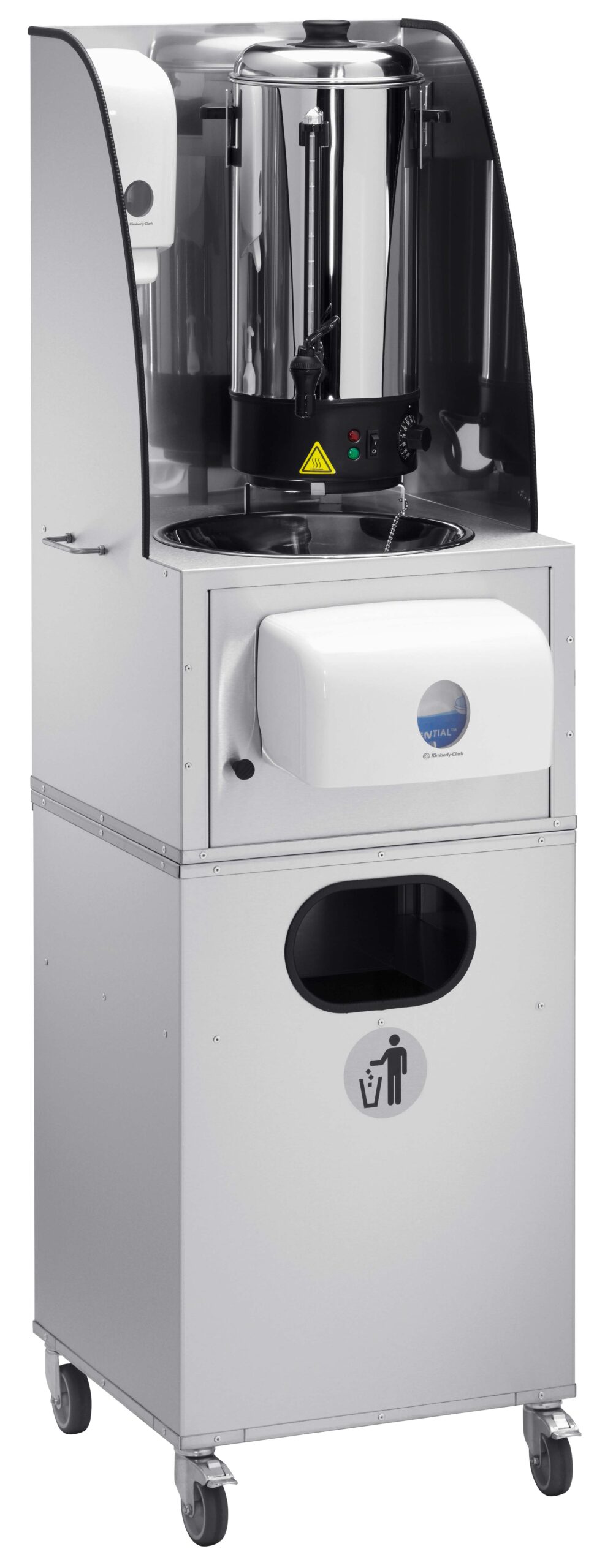 Gehäuse Edelstahl • 10 Liter Heißwasserspender • Integrierter Abwasserauffangbehälter • Seitlicher Spritzschutz • Waschschüssel mit Ablass und Gummistopfen • Seifenspender • Papierhandtuchspender • Desinfektionsmittelspender • Standmodell mit Lenkrollen aus Metall • 2 Feststellbremsen • Integrierter Abfalleimer