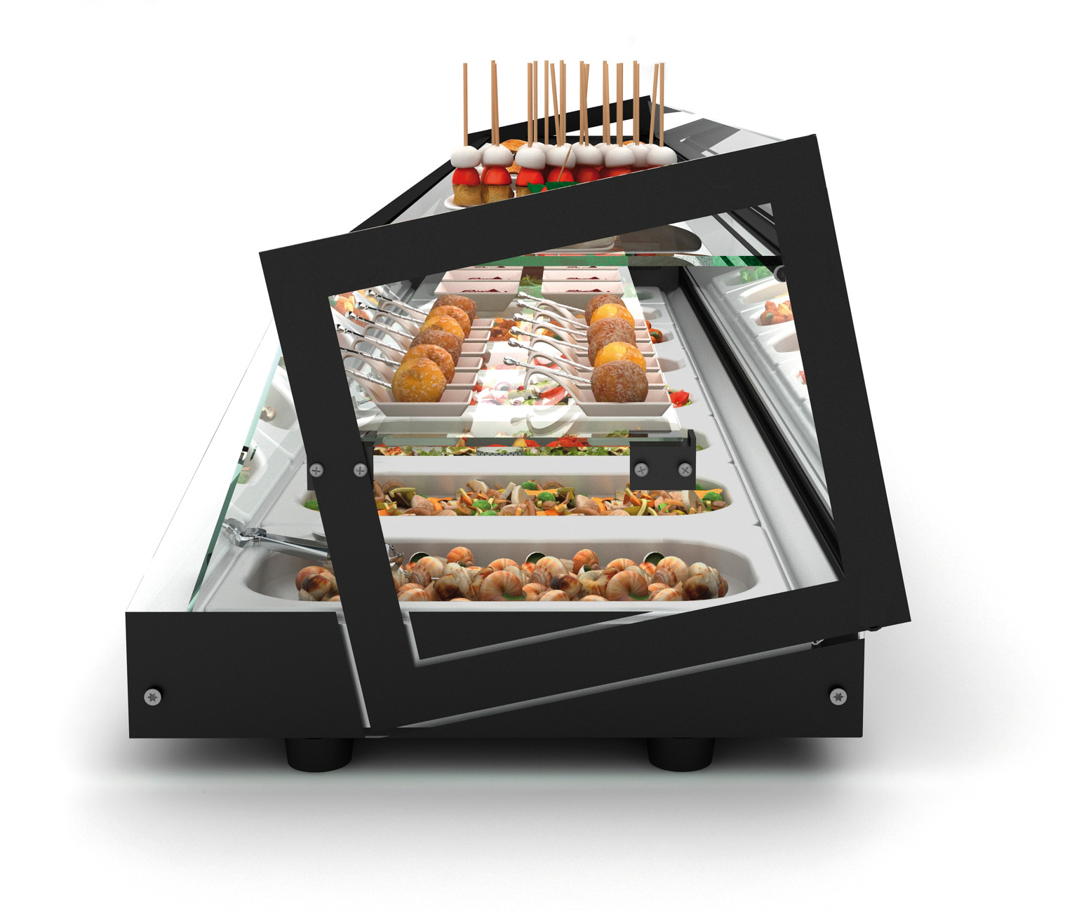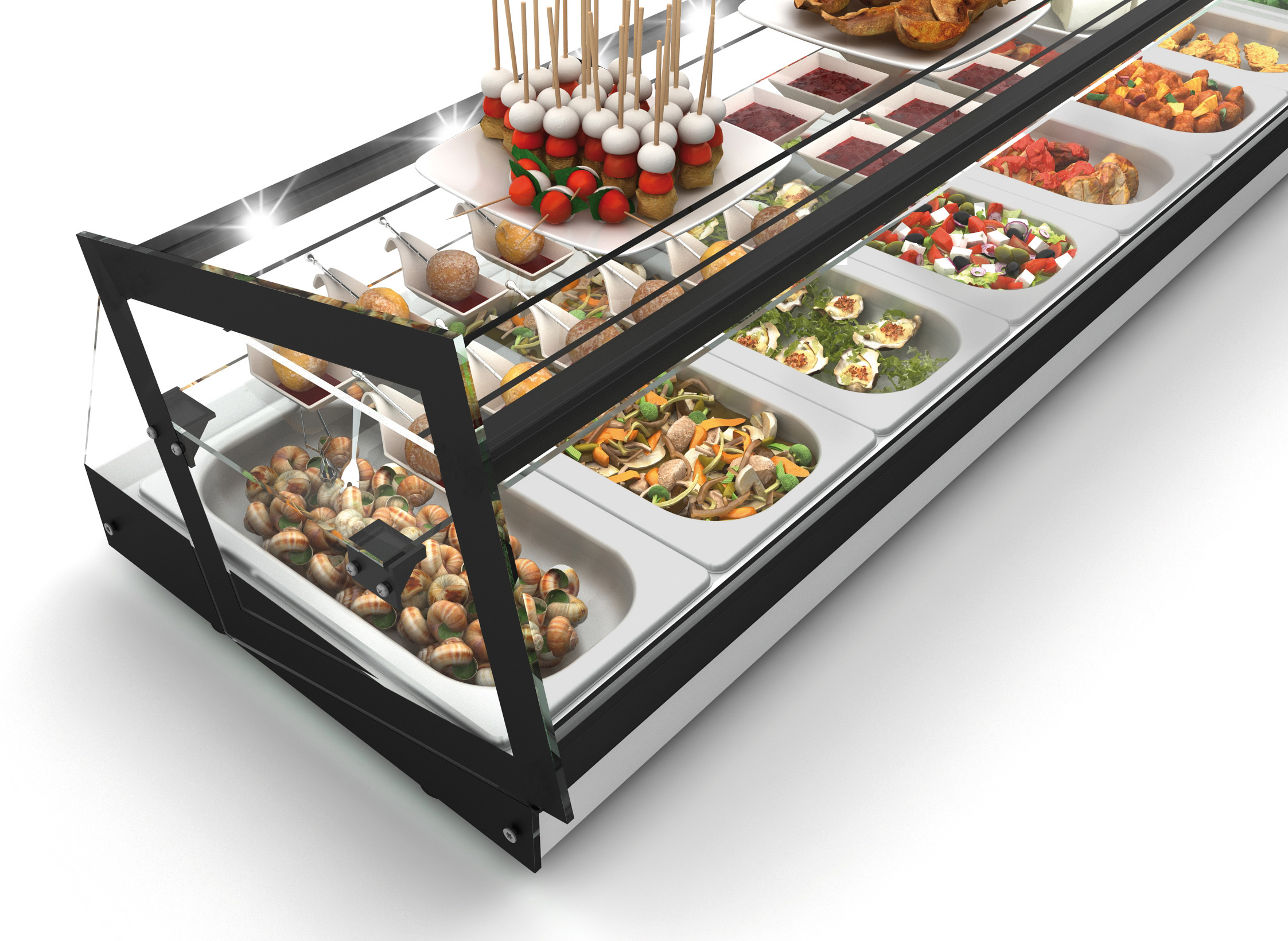 3 Ebenen (gekühlte GN-Behälter, innere Glasablage, Top-Ablage) • +2°C bis +5°C im Schalenbereich • Scheiben aus gehärtetem Glas • digitale Temperaturanzeige • LED-Beleuchtung • Qualitätskompressor • GN-Schalen nicht im Lieferumfang enthalten • für 6x 1/3 GN 40 mm tief