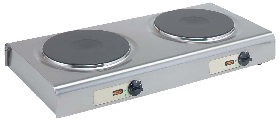 Gehäuse Edelstahl • 2 Kontrollleuchten • 2 Stufenschalter • 2x EGO® Gussheizplatten à Ø 300 mm • höhenverstellbare Füße
