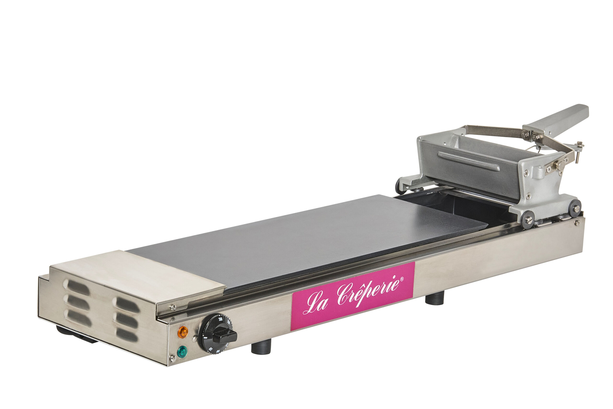 Crêpesmaschine mit Teigverteilsystem für die Herstellung von frisch gebackenen, rechteckigen Mini-Crêpes • Besonders einfache Bedienung: Mit dem rollenden Teigverteiler tragen Sie den Teig gleichmäßig dünn auf die Backplatte auf. So gelingen Ihre Crêpes perfekt. • Ideal für Streetfood-Festivals, Volksfeste, Kirmes oder Märkte: Mit La Crêperie können Sie bis zu 120 Crêpes pro Stunde backen • Platzsparend: La Crêperie ist nur 30 cm tief. • Der rechteckige Crêpe bietet zusätzliche Serviermöglichkeiten. Man kann ihn ideal zusammenrollen und dann z.B. in Scheiben geschnitten als Sushi-Crêpes anbieten. • Statt einzelnen Crêpes können Sie auch einen durchgehenden, langen Crêpe backen • Thermostatische Regelung • Gehäuse Edelstahl • Backplatte antihaftbeschichtet (Nicht mit Metallwerkzeug auf der Backplatte arbeiten!) • Optische Unregelmäßigkeiten auf der Backplatte stellen keinen funktionellen Mangel dar • Backplatte 497 x 200 mm