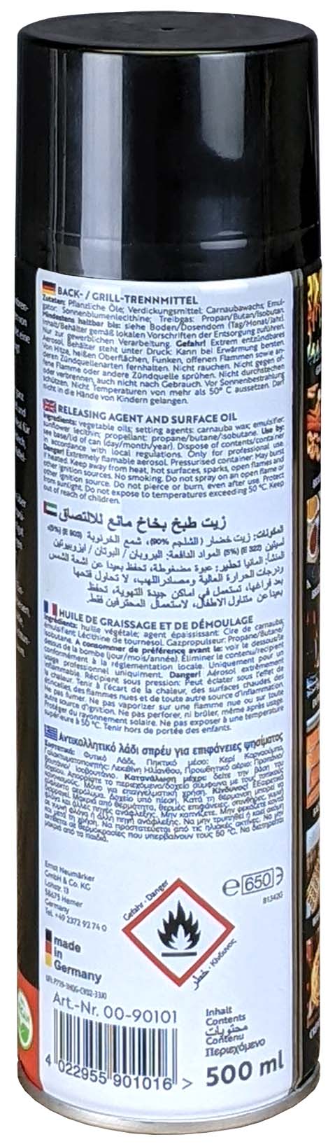 Jetzt noch besser: Optimierter Sprühkopf und verbesserte Rezeptur. Die einfachste und schnellste Lösung, um Grill- und Backplatten dünn und gleichmäßig einzufetten • Perfekt zum Einbrennen und Pflegen von Gusseisen. Bildet eine Patina und beugt Korrosion vor • Antihafteffekt ganz einfach, schnell und gleichmäßig • Ideal für Grillrost, Bratplatten, Pfannen, Dutch Ovens, Backbleche, Waffeleisen oder Crêpesplatten • Geeignet zum Einfetten von Gusseisen, Edelstahl, Emaille, Antihaftbeschichtungen, Keramik u.v.m. • Trennmittel-Spray auf pflanzlicher Basis • Sprühdose à 500 ml • ACHTUNG! Dieser Artikel ist nur für den professionellen Einsatz zugelassen und darf nicht an Privatpersonen verkauft werden