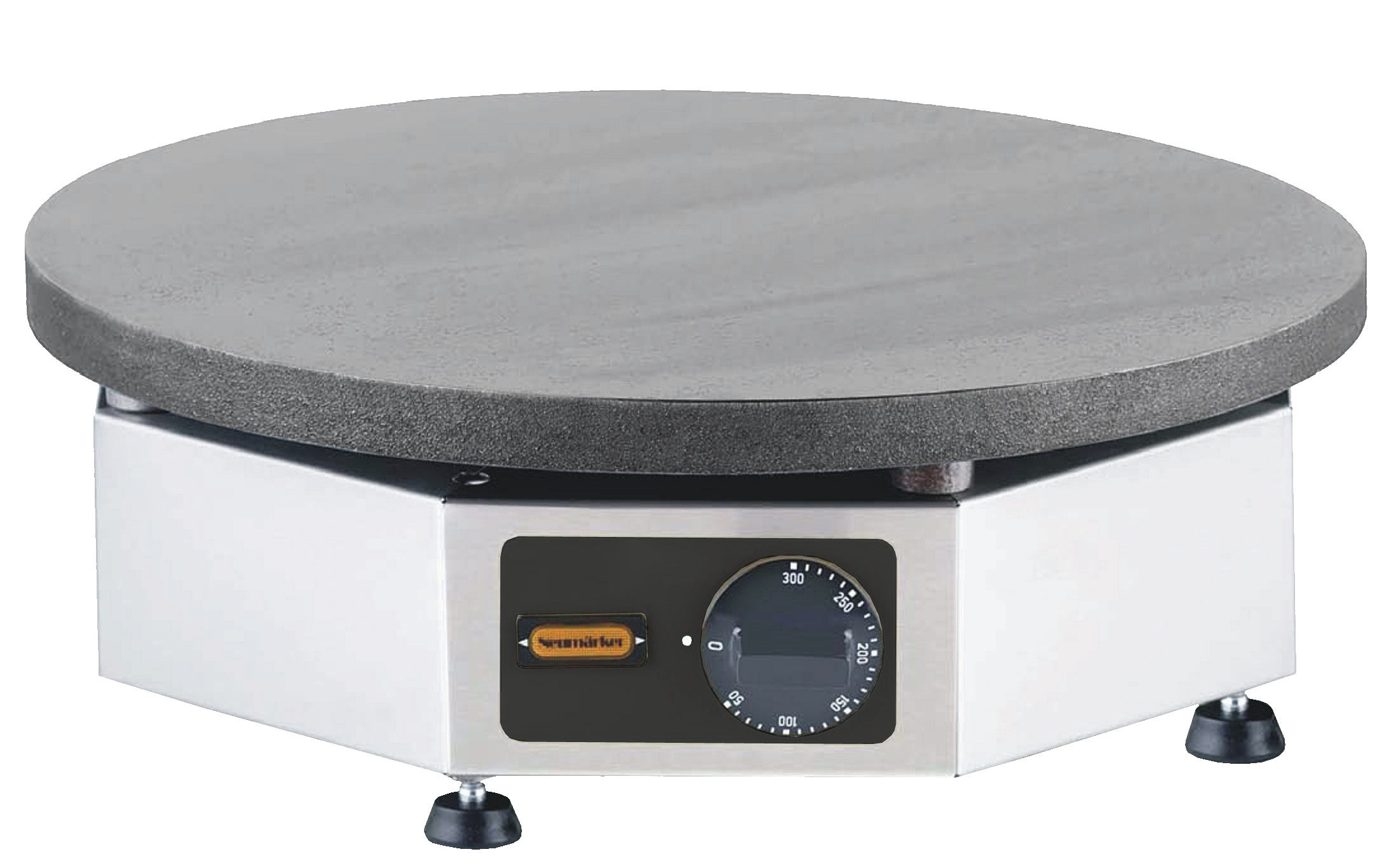Massives Gusseisen für gleichbleibende Hitze, auch bei kalten Außentemperaturen • Flächenheizkörper: Gleichmäßige Hitzeverteilung über die gesamte Backplatte • Effiziente Energienutzung durch optimalen Kontakt zwischen Heizkörper und Gussteil • Gehäuse Edelstahl • Graugussbackplatte Ø 400 mm • Thermostat • Kontrollleuchte • Höhenverstellbare Füße
