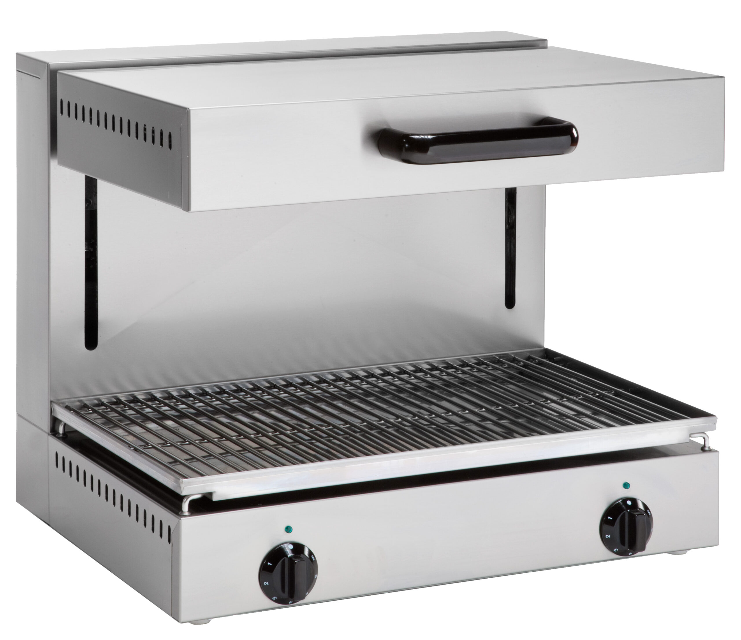Gehäuse Edelstahl • Sammelschale für Krümel und Fett aus Edelstahl • Schale und Rost abnehmbar • verstellbares Oberteil • Heizkörper zur leichten Reinigung herunterklappbar • Wandkonsolen für Wandbefestigung auf Anfrage • Arbeitsfläche 600×350 mm • geeignet für 1/1 GN • 2 Heizzonen rechts/links