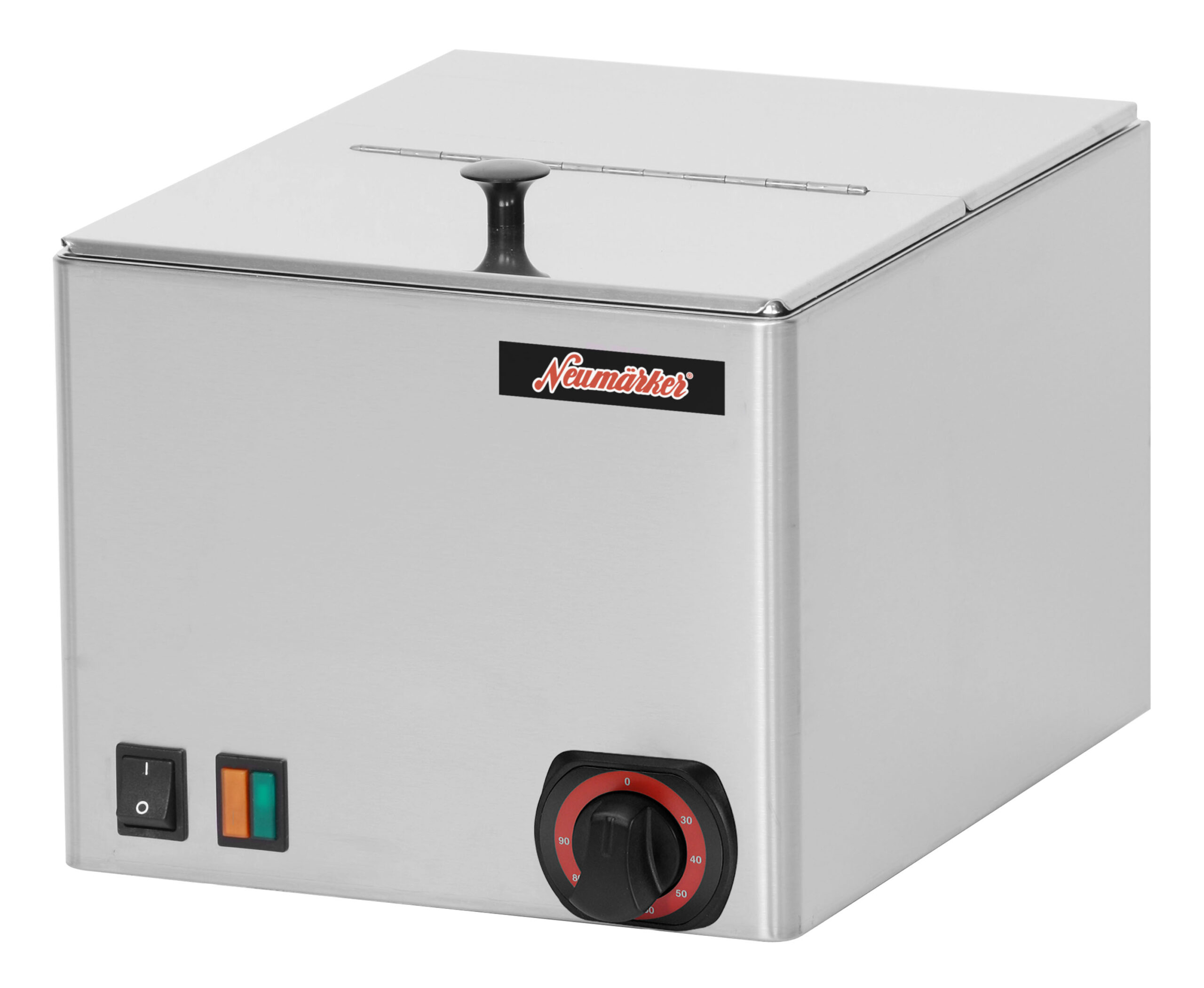 Aufklappbare, abnehmbare Deckel • Eingearbeiteter Behälter nicht entnehmbar • Ein-/Ausschalter • Kontrollleuchten • Thermostatische Regelung • Temperaturbereich 30-90°C • Becken 240x300x150 mm • Gehäuse Edelstahl
