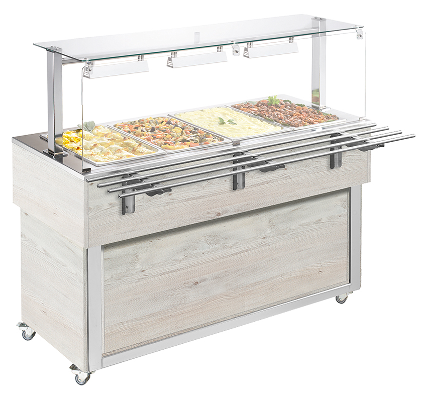 • feststehender Glas-Hustenschutz, Halogenheizstrahler (unter oberer Ablage)