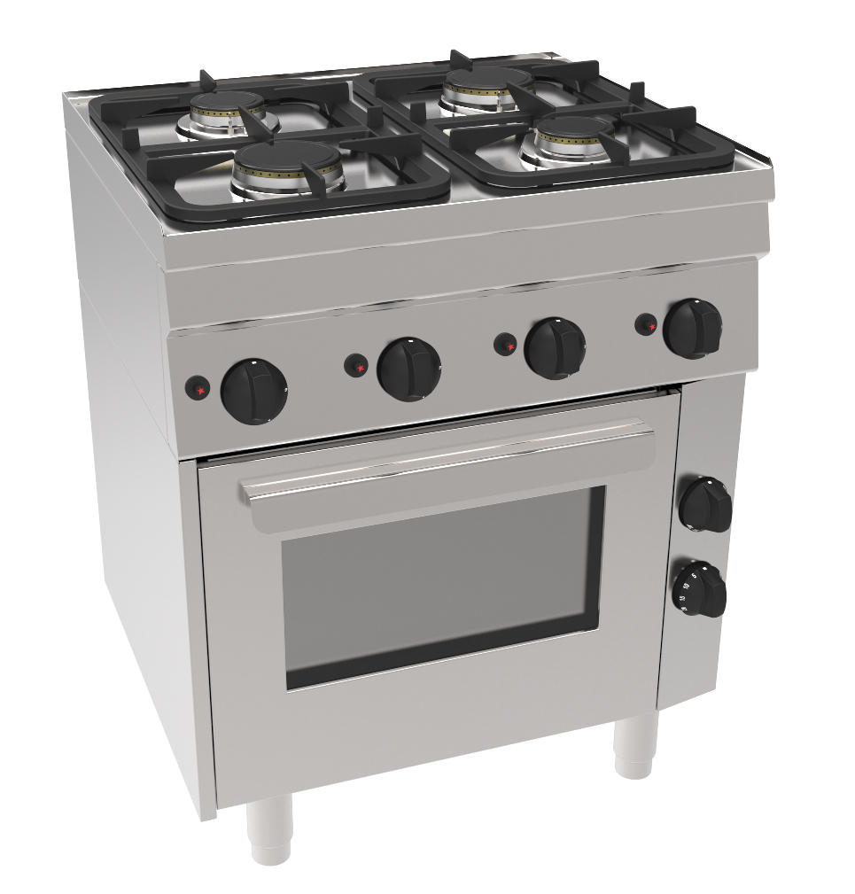• Piezo-Zündung, Thermo-Sicherheitselement je Brenner, Kochstellen-Abstellgitter aus emailliertem Gusseisen, Umluftheizung