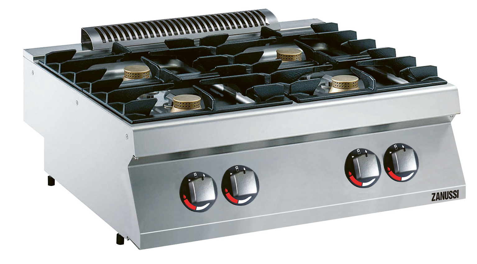 • Pilot-Zündflamme, Zündsicherung je Brenner, Kontrollflamme je Brenner, Kochstellen-Abstellgitter aus emailliertem Gusseisen