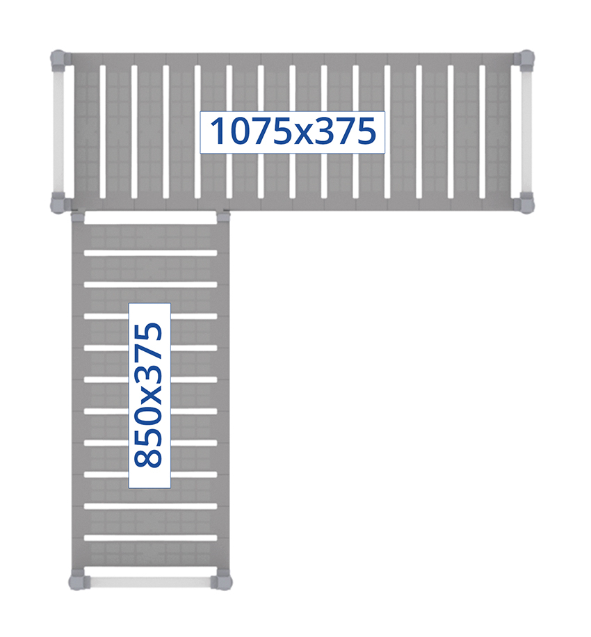 - Regalstützen aus eloxiertem Aluminium (20 µm), Befestigungen, Schrauben usw. nicht sichtbar, Lamellen aus Polyethylen (PE-HD), hellgrau