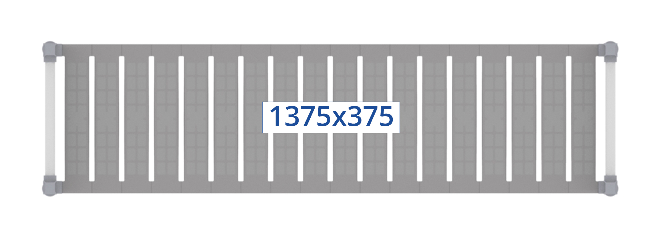 - Regalstützen aus eloxiertem Aluminium (20 µm), Befestigungen, Schrauben usw. nicht sichtbar, Lamellen aus Polyethylen (PE-HD), hellgrau