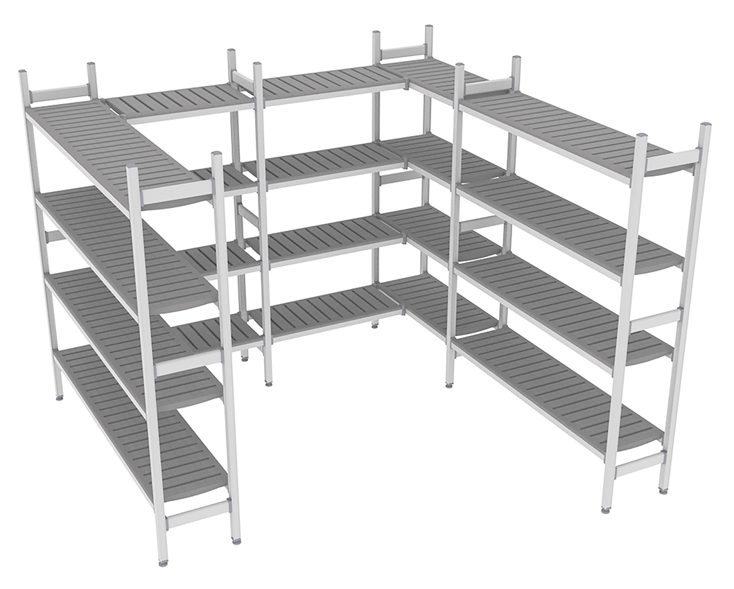 - Regalstützen aus eloxiertem Aluminium (20 µm), Befestigungen, Schrauben usw. nicht sichtbar, Lamellen aus Polyethylen (PE-HD), hellgrau