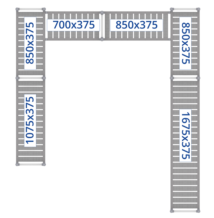 - Regalstützen aus eloxiertem Aluminium (20 µm), Befestigungen, Schrauben usw. nicht sichtbar, Lamellen aus Polyethylen (PE-HD), hellgrau
