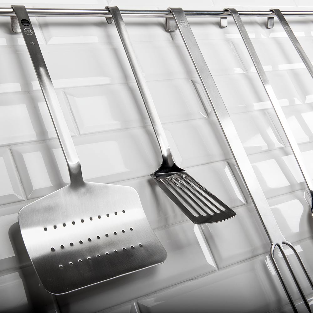 Durch die Aufhängung am Griffende ist das professionelle Kochbesteck immer griffbereit an Ihrem Arbeitsplatz.