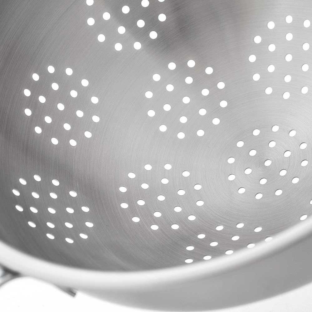 Das universelle Sieb mit einem Durchmesser von 260 mm hat einen runden Korpus mit kreisförmig angeordneten Löchern von ca. 3,4 mm Durchmesser.