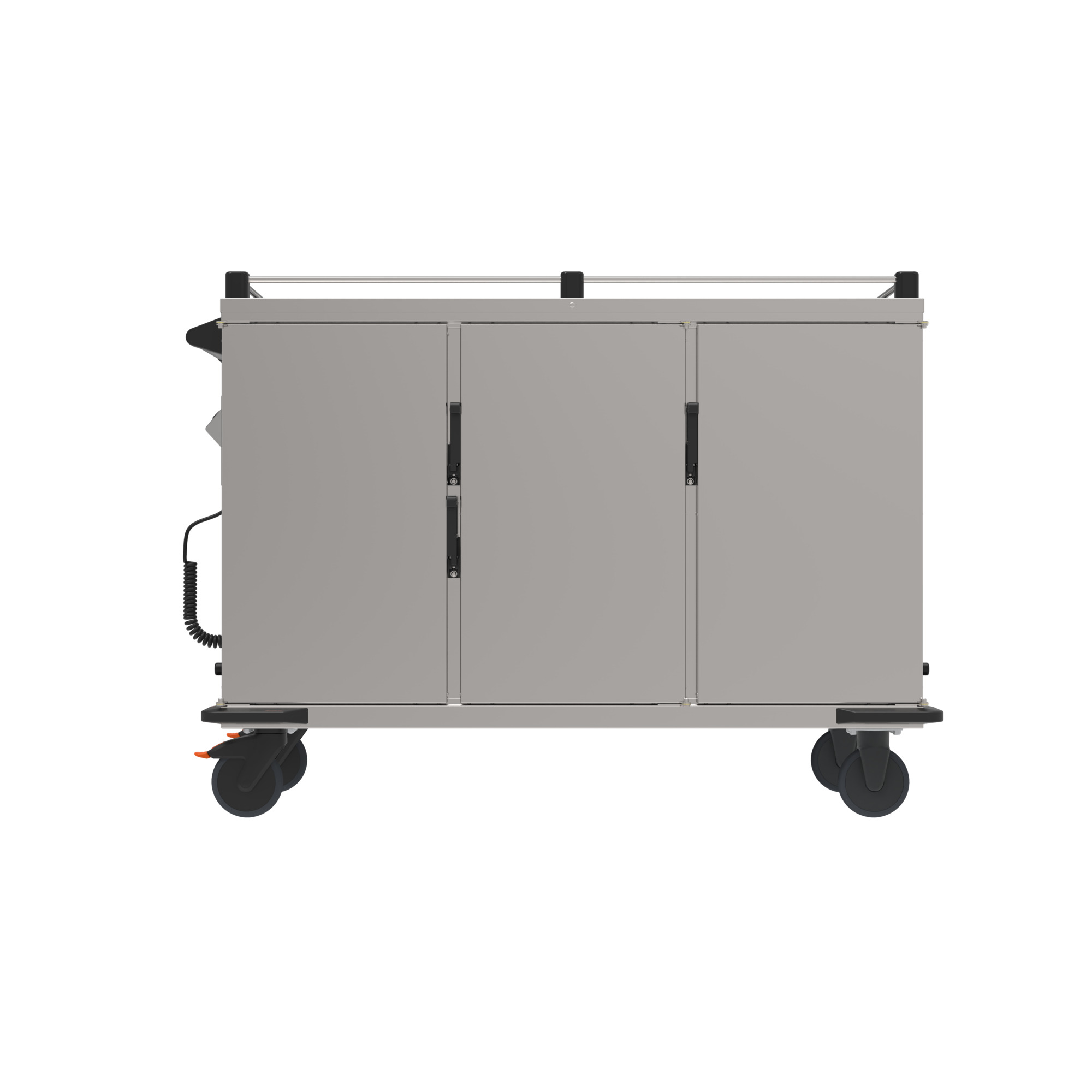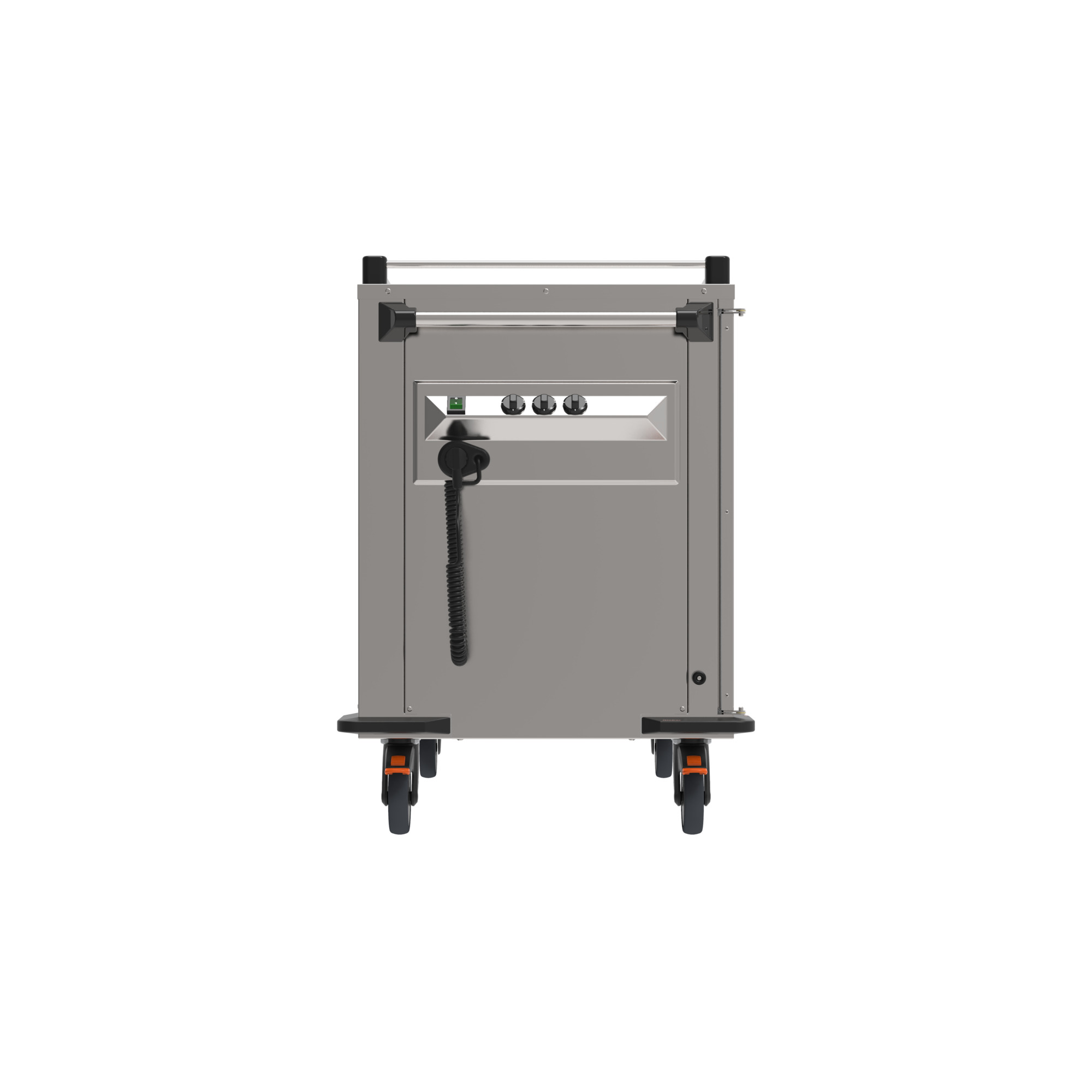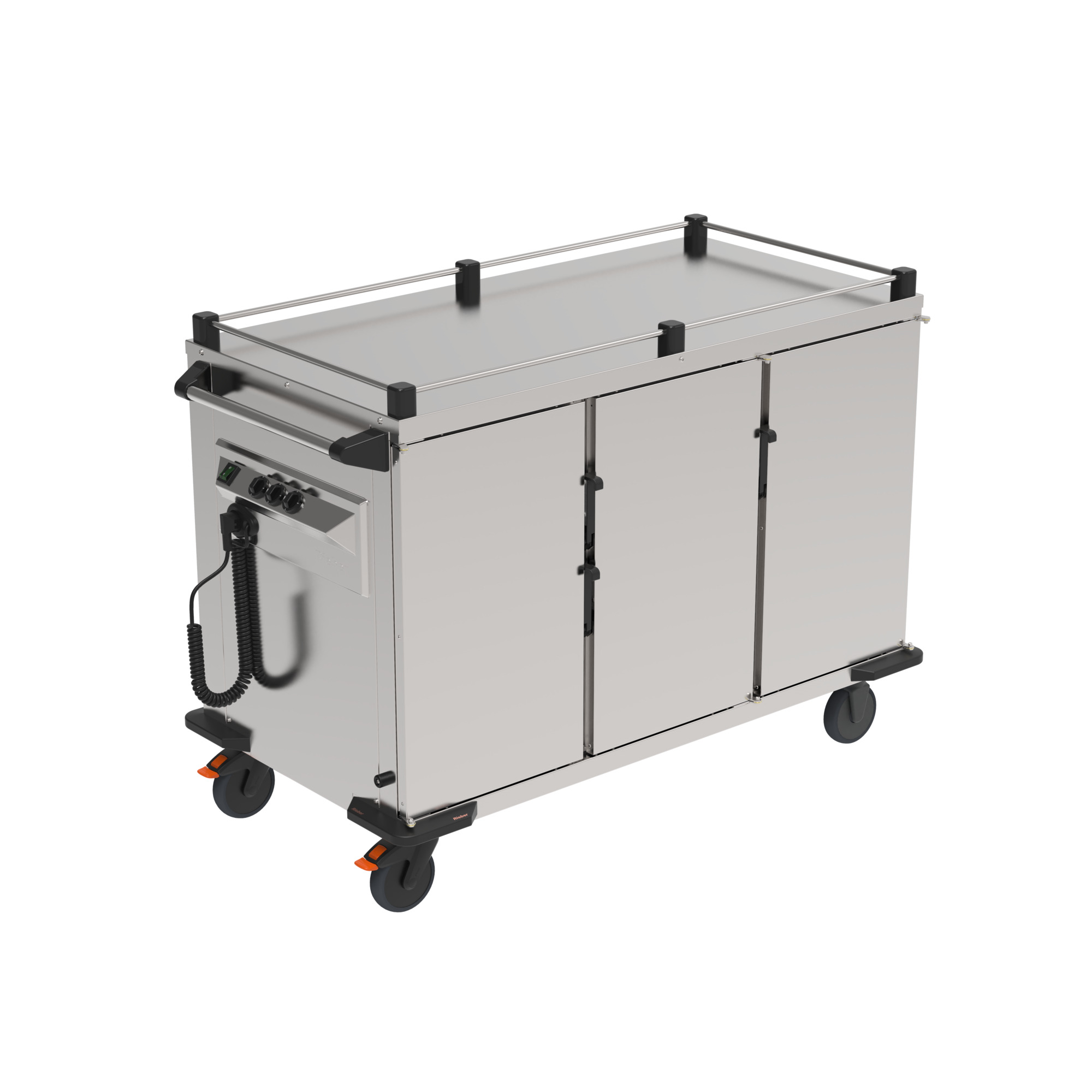 Der robuste Speisentransportwagen oben mit glatter Abdeckung inklusive umlaufender Galerie und unten mit drei getrennt regelbaren, elektrisch beheizten Schrankfächern, dient zum sicheren Transport, Warm- und Kalthalten sowie Ausgeben von Speisen im GN-System. Für beste Speisenqualität in der Speisenverteilung.