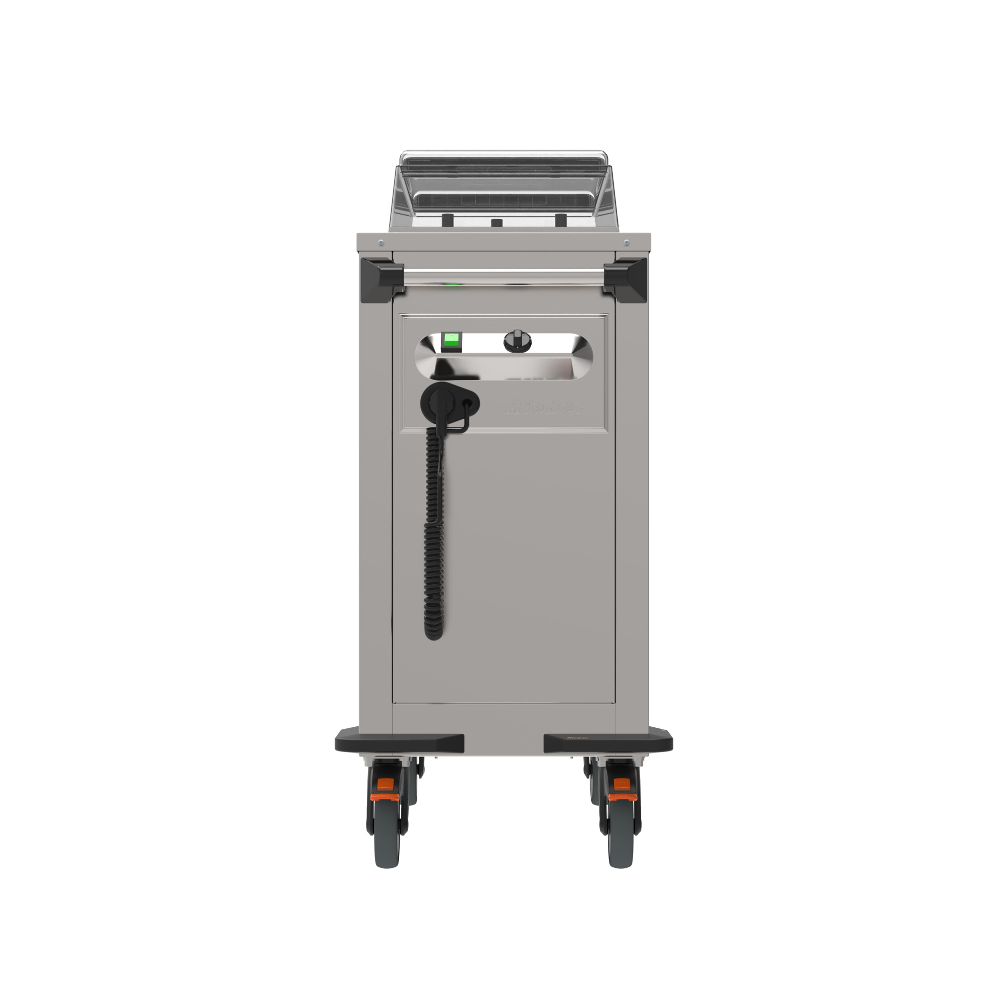 Mobil mit rostfreien, feststellbaren Rollen und Sicherheitsschiebegriff.