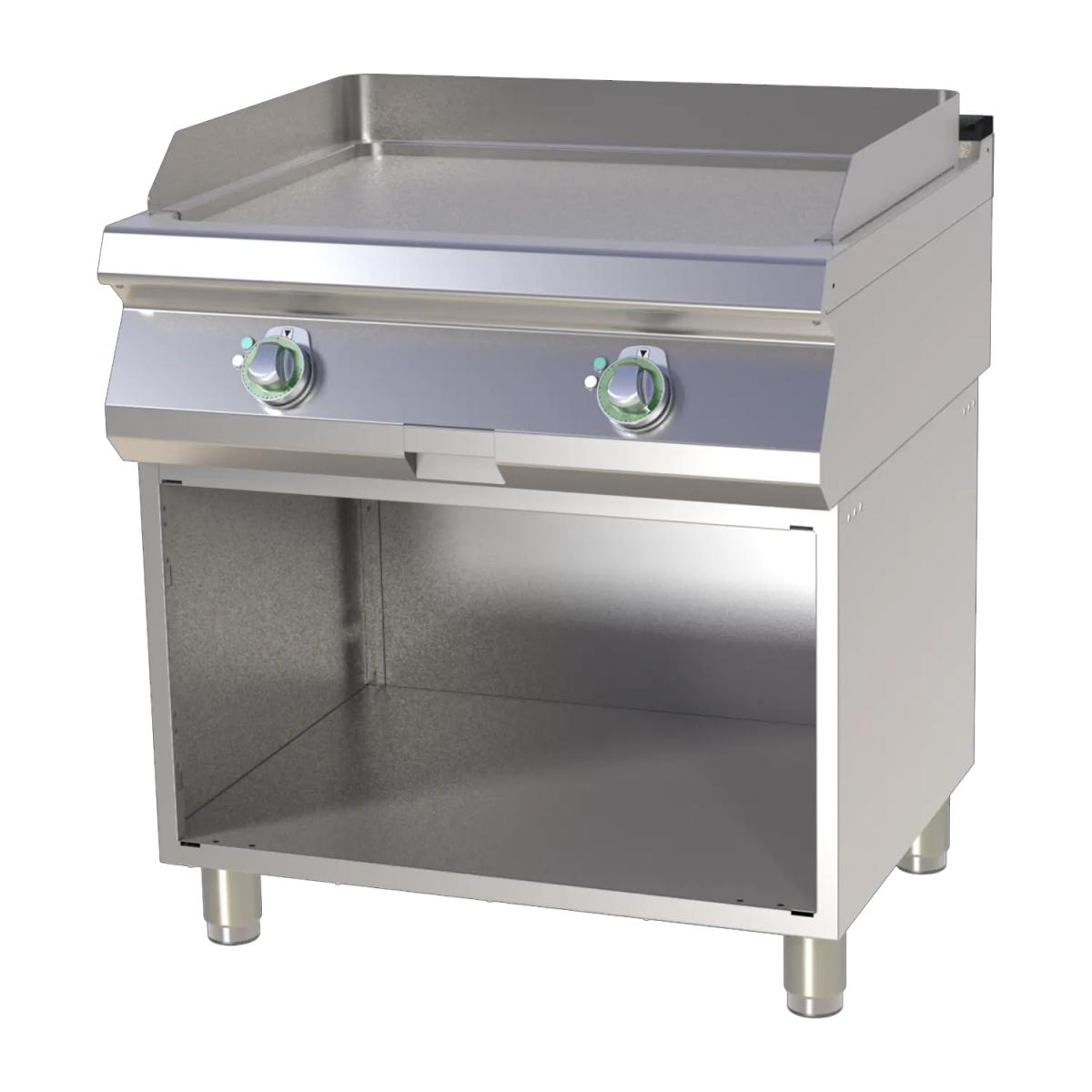 Grillplatte Elektro, mit offenem Unterbau 800 x 730 x 900 mm Hergestellt aus AISI 304 Arbeitsplatte Stärke 1,5 mm Flacher Rückseitiger Kamin mit Gusseisengitter Grillfläche glatt, verchromt 2 Heizzonen, Temp. +50°C / +300°C Grillfläche 770 x 560 mm, Stärke Grillplatte 12 mm Mit festem Spritzschutz und Fettauffangschublade Sicherheitsthermostat 360°C 400 V, 50-60 Hz, 9,0 kWElektro-Grillplatte mit offenem Unterbau aus Edelstahl