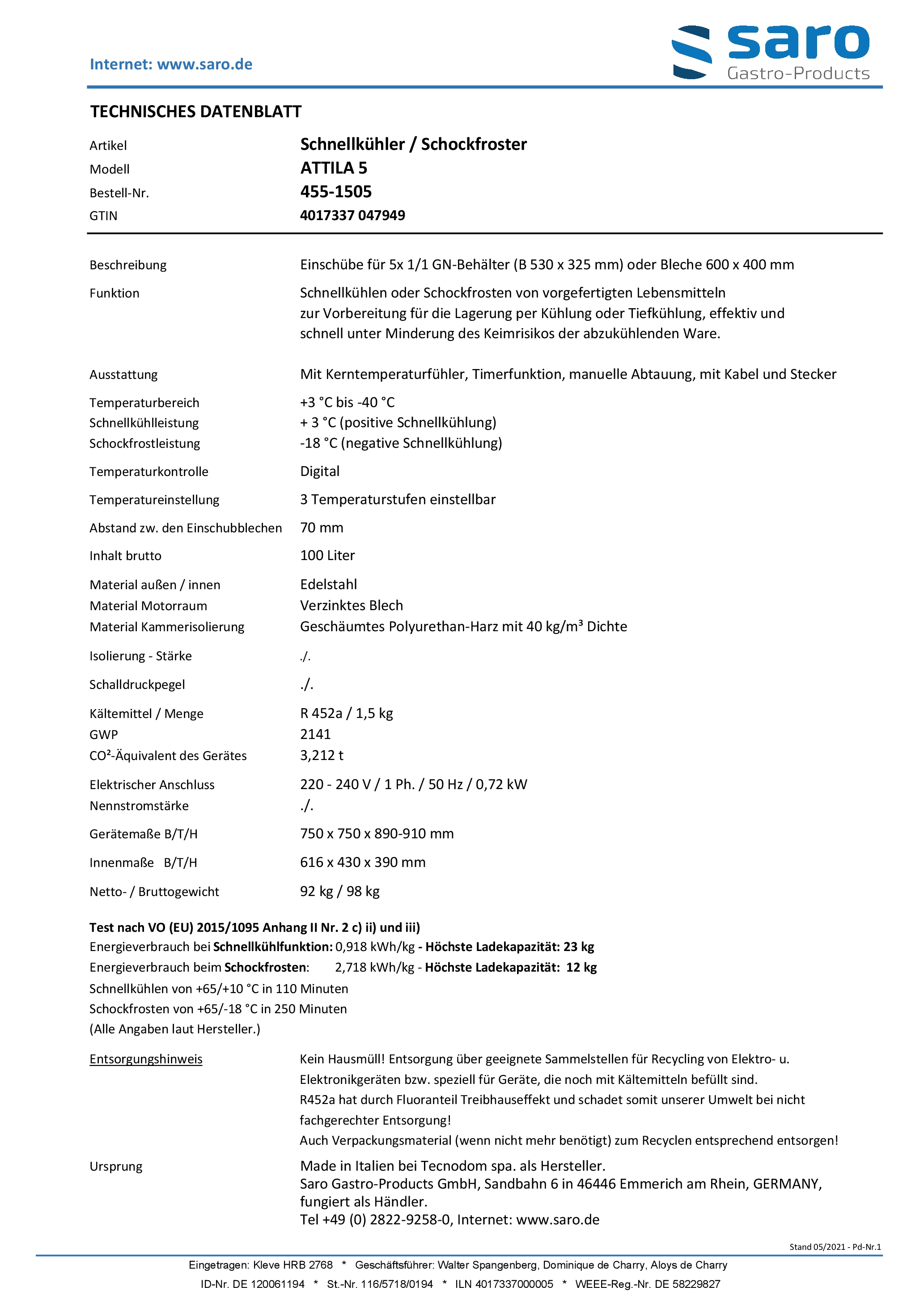 Produktanfrage SARO Schockfroster - 5 x 1/1 GN, Räder, Modell ATTILA 5