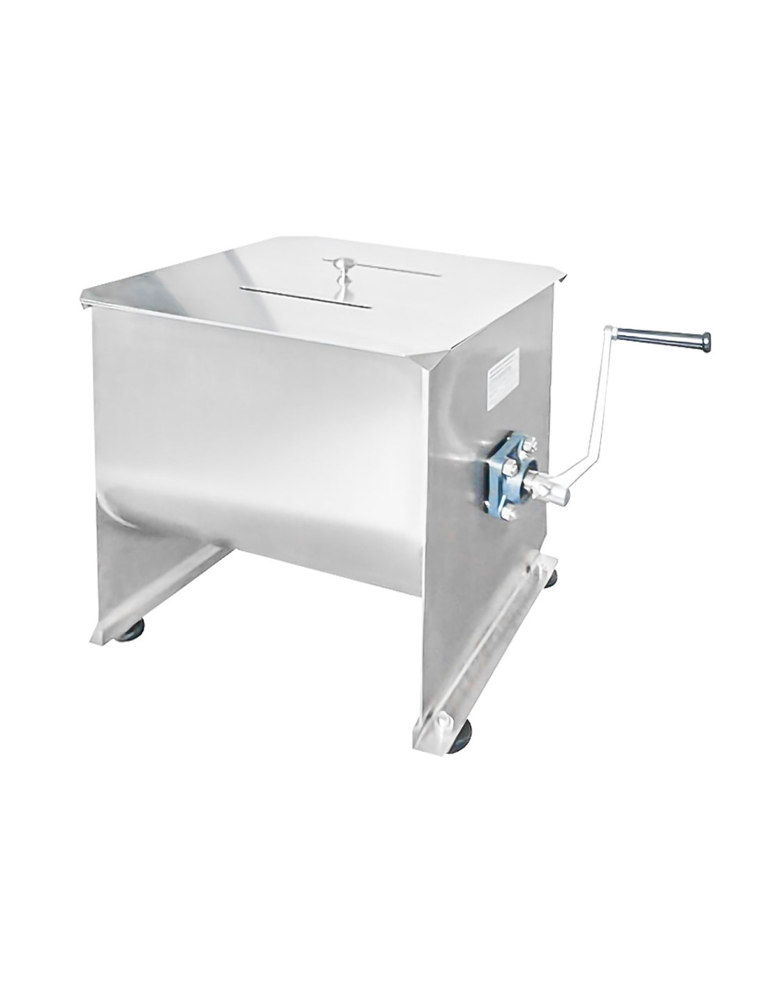 Der manuelle Fleischmischer ist ein zuverlässiges Gerät für die professionelle Verarbeitung von Fleisch-, Gemüse- oder Backmischungen. Mit einem Gesamtvolumen von 10 Litern und einer maximalen Füllmenge von 6,5 bis 7 kg ermöglicht er ein schnelles und gleichmäßiges Mischen der Zutaten.Die robuste Schüssel ist mit einer praktischen Kippfunktion ausgestattet, die das Entnehmen des Mischguts erleichtert. Eine Arretierung sorgt für Stabilität während des Betriebs. Die Handkurbel ermöglicht die Steuerung des Mischvorgangs ohne Stromanschluss und damit unabhängig von externen Energiequellen.Der hochwertige Edelstahl ist nicht nur besonders langlebig, sondern auch äußerst hygienisch, da alle Komponenten zur gründlichen Reinigung zerlegbar sind. Der mitgelieferte Deckel schützt die Zutaten während des Mixvorgangs und die rutschfesten Füße sorgen für einen sicheren Stand auch bei intensiver Nutzung.