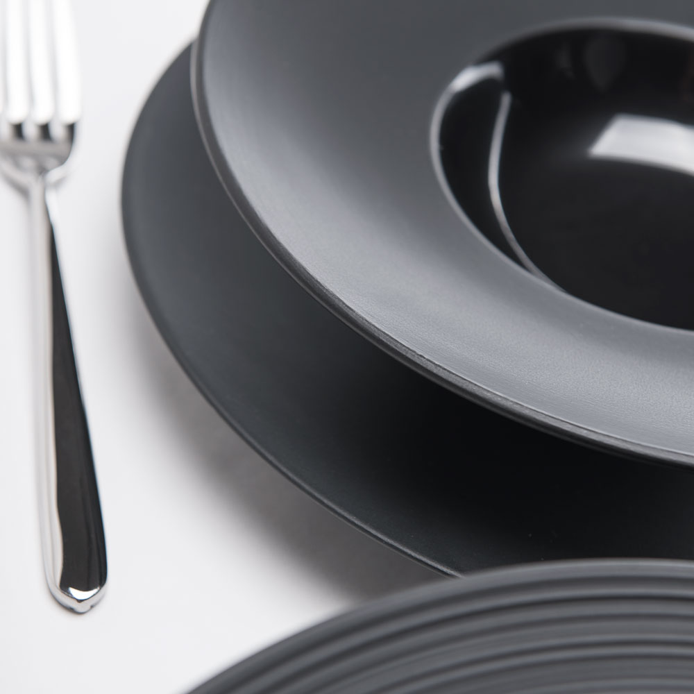 Speisegeschirr neu interpretiert! Die trendige Serie Gourmet Kontrast aus schwarzem Porzellan setzt optische Akzente.