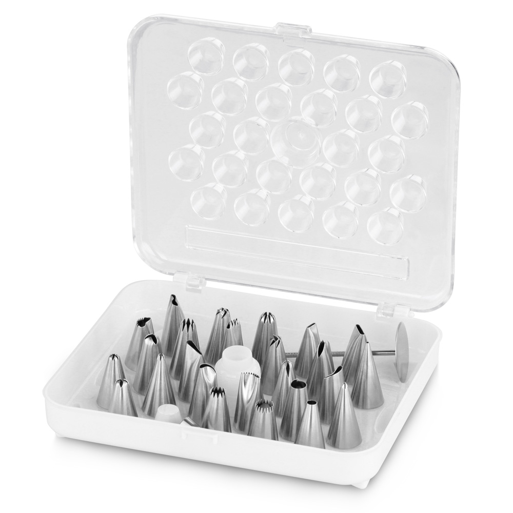 Das 26-teilige Spritztüllen-Set aus hochwertigem Edelstahl bietet eine vielseitige Auswahl an Tüllen zum kreativen Dekorieren von Kuchen, Torten und Gebäck. Die verschiedenen Formen wie Sterntüllen, Lochtüllen und Blumentüllen ermöglichen kunstvolle Muster und Designs.Das Set wird in einer praktischen Aufbewahrungsbox geliefert, die für Ordnung sorgt und die Tüllen vor Beschädigungen schützt. Zusätzlich enthält das Set einen Blumennagel aus Edelstahl und einen Adapter aus Kunststoff für die einfache Handhabung mit Einweg- und Mehrweg-Spritzbeuteln.Die Edelstahl-Tüllen sind langlebig, rostfrei und leicht zu reinigen – ideal für den professionellen Einsatz oder für ambitionierte Hobbybäckerinnen und -bäcker.