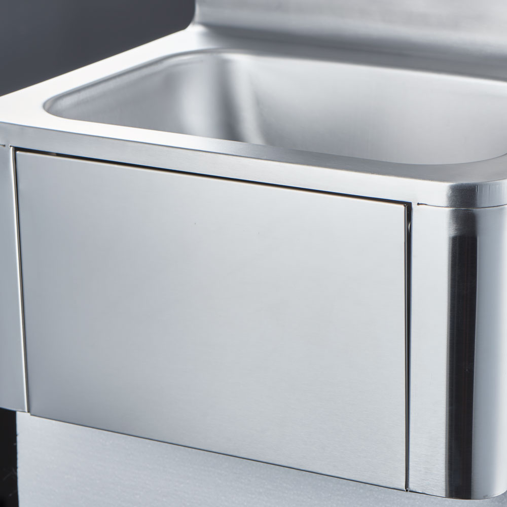 Einfacher lassen sich Ihre verschmutzten Hände nicht reinigen!Über den extra großen Kniedrücker öffnen Sie den Wasserzulauf schnell, hygienisch und einfach!Das funktionale, festverschweißte Handwaschbecken mit einer Beckengröße von ca. 40 cm x 33,5 cm ist aus rostfreiem Edelstahl gefertigt und für die Wandmontage bestimmt.Das hohe Wandpaneel schützt Ihre Wand vor Wasserspritzern und ist ideal, um den mitgelieferte Seifenspender mit Einhandbedienung zu montieren.Mit der Lieferung erhalten Sie die passende Armatur und Schläuche! So ist Ihr Handwaschbecken in Kürze einsatzbereit!