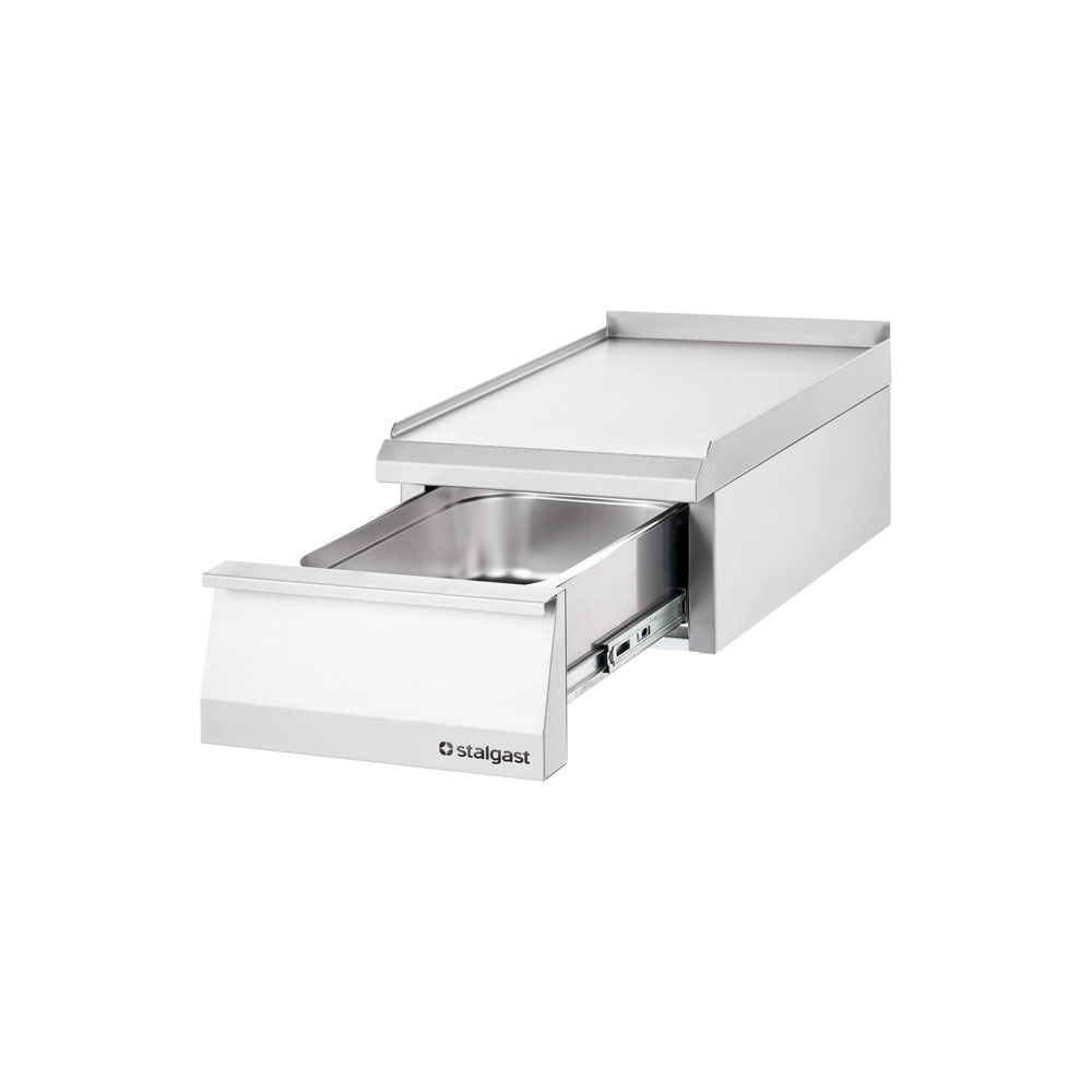 Wenn Sie Ihre Traumküche mit Kochgeräten und Schränken der Serie 700 ND von Stalgast ausstatten, dürfen Sie Stauraum und Arbeitsfläche nicht außer Acht gelassen werden.Dieses Neutralelement mit einer Breite von 40 cm bietet Ihnen beides und kann in Kombination auf allen Unterbauten der Serie eingesetzt werden.Auf der glatten Oberfläche aus hygienischem, lebensmittelechten Edelstahl schneiden Sie Ihre Zutaten, richten Ihre Speisen an oder nutzen die große Fläche zum Abstellen. Die vordere Kante ist für ein ideales Arbeiten leicht geneigt.Die Schublade lässt sich anhand der durchgehenden Griffleiste vollständig ausziehen für eine bessere Übersichtlichkeit oder um einen GN1/1-Behälter bequem einzusetzen (max. H. 150 mm). Gummidämpfer schützen vor einem lauten Schließen der Schublade. Durch die schräggestellte Blende gliedert sich das Neutralelement nahtlos in die Reihe Ihrer Geräte der Serie 700 ND ein.Schaffen Sie für sich und Ihre Mitarbeiter einen auf Ihre Bedürfnisse abgestimmten, organisierten Arbeitsplatz, der Ihre professionelle Kochkunst unterstützt, Ihre Zusammenarbeit stärkt und zu einem Ort des Wohlfühlens wird – Ihre Gäste werden es merken!