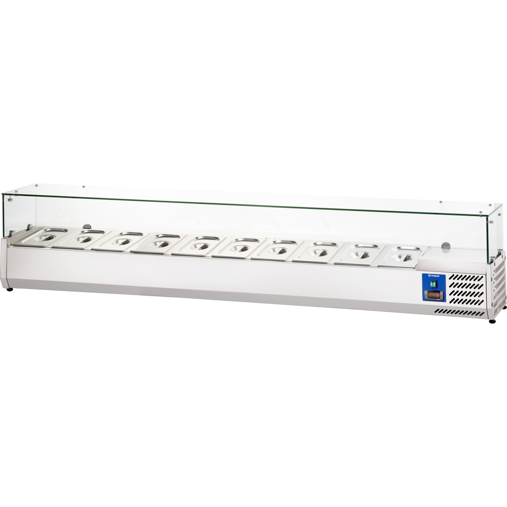 Bei geringen Raumbedarf können Sie in den Kühlaufsatz bis zu zehn GN-Behälter einsetzen. Die Entnahme/das Befüllen der Behälter ist dank der Schrägstellung übersichtlich und einfach.Unterhalb der Behälter befindet sich die isolierte Kühlzone, deren Temperatur Sie in einem Bereich von +2/+8 °C manuell einstellen können. Über das Bedienelement mit Digitalanzeige kontrollieren Sie ebenso die Umgebungstemperatur und starten die Abtauung.Mit dem portablen Kühlaufsatz gestalten und erweitern Sie Ihren Arbeitsraum nach Ihren Wünschen. Das schlichte, zeitlose Design ermöglicht auch eine Aufstellung zur Präsentation der frischen Zutaten im Frontbereich Ihrer Gastronomie. Die Glasabdeckung dient hier als Spuckschutz und Ablage gleichermaßen.Dieser Kühlaufsatz ist ebenfalls für 4, 5, 7 oder 8 GN 1/3 oder 1/4-Behälter erhältlich.Die GN-Behälter sind nicht im Lieferumfang enthalten!Die Serie Starline Ihres Gastronomie-Experten Stalgast überzeugt durch solide verbaute, bewährte Komponenten in Profi-Qualität zu günstigen Preisen!